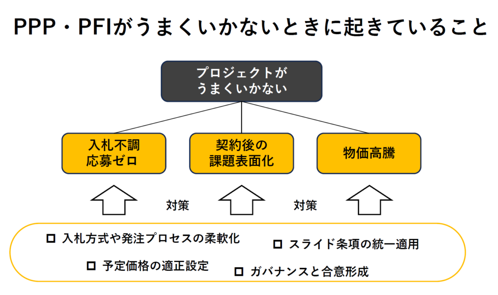 制度が整備され、一定の導入実績も積み上がってきたPPP/PFIですが、実際にはうまくいかない、あるいは途中で頓挫するプロジェクトも少なくありません。第4回では、こうした“つまずき”の実情に焦点を当て、その背景にある構造的な要因と、公的ガイドラインが示す改善の方向性を整理します。